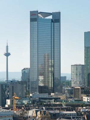 La tour de bureaux contient 23 ascenseurs et offre 118 000 mètres carrés de surface, avec un accès direct depuis la station Taunusanlage.