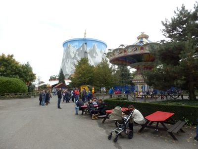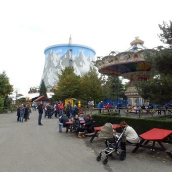 À l'intérieur de la tour de refroidissement, un manège à chaînes tourne sous le dôme de béton d'origine et un mur d'escalade s'élève le long de sa surface intérieure incurvée. Le passé technique reste visible pendant que les visiteurs se déplacent entre les attractions construites dans l'ancienne coquille industrielle.