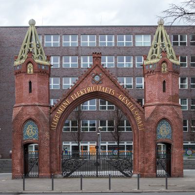 L'architecte Franz Schwechten a conçu cette porte en 1896 pour le complexe AEG en expansion de Humboldthain. Le bâtiment a été créé durant une période de croissance industrielle rapide à Berlin, quand les grandes entreprises agrandissaient et modernisaient leurs installations.