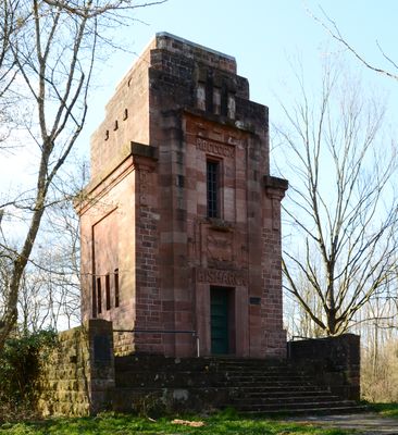La Bismarckturm atteint 12 mètres de hauteur avec une base carrée de 6.1 mètres, construite en grès rouge caractéristique de la région du Palatinat du Sud.