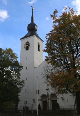 Le clocher a perdu sa flèche d'origine pendant la Seconde Guerre mondiale et se dresse maintenant à côté de l'ancien couvent au nord.
