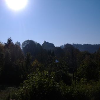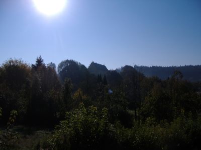 Le château de trois étages présente une structure à toit en pignon avec plusieurs axes, positionné sur une colline surplombant le paysage bavarois.
