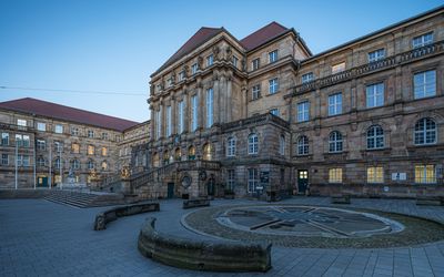 Le Rathaus Kassel est un bâtiment d'administration municipale situé au centre-ville, marqué par deux lions hessois dorés de part et d'autre de l'escalier extérieur et les armoiries municipales au-dessus de l'entrée principale. La façade affiche une architecture impressionnante avec des détails soigneusement élaborés sur toute l'élévation avant.