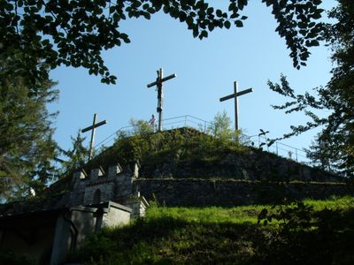 Kalvarienberg Füssen est un site de pelerinage avec des chapelles dispersees sur les pentes d'une colline au-dessus de la ville. Au sommet se trouve une plateforme avec trois croix et une sculpture metallique du Christ.