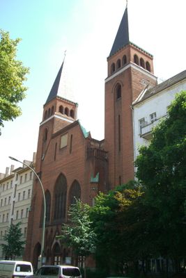 L'église Paul Gerhardt présente deux tours de 40 mètres de hauteur et des murs en briques rouges intégrés dans l'alignement résidentiel de Wisbyer Strasse.