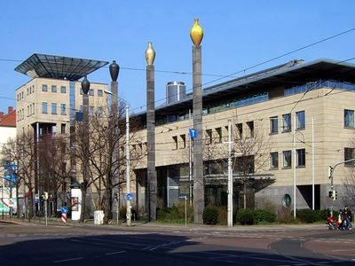 Gesamtanlage eines Schlacht- u. ViehhofesSeit 1993 Gelände des Mitteldeutscher Rundfunk mit Erhalt einiger alter Bauten Kantstraße 69; 71; 73