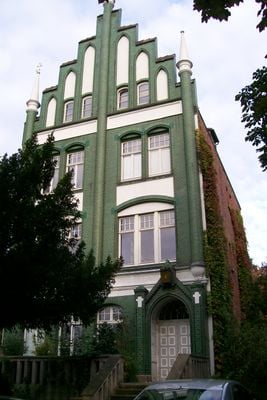 L'édifice présente une façade en briques émaillées vertes, un pignon à gradins et deux petites tours, dont une subsiste aujourd'hui.