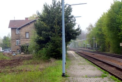La gare de Rohrbach présente une architecture ferroviaire allemande avec des murs en briques rouges et des fenêtres en arc sous un toit caractéristique.
