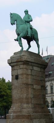 Le monument Bismarck représente Otto von Bismarck à cheval, tenant un parchemin et portant l'uniforme du régiment des Cuirassiers.