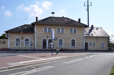 La gare d'Usingen présente un bâtiment d'entrée avec des ouvertures en arc et des toits à quatre pentes, comprenant deux voies le long d'un quai central.