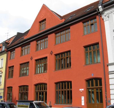 Werkzeug-Maschinenfabrik A. Schärfls Nachf., in Häuserzeile stehende Fassade von Wohnhausformat mit großen Fabrikfenstern und neugotischer Gliederung, um 1890