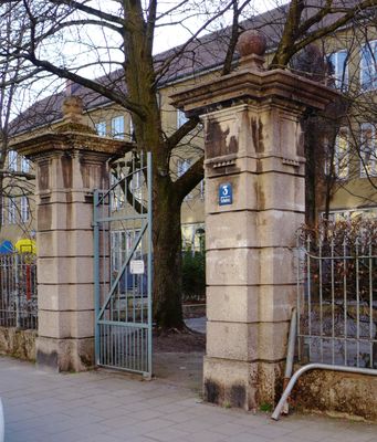 Torpfeiler Schulstraße 3, Samt Gitter als Begrenzung des Schulhofs gegen die Straße, Ende 19. Jahrhundert