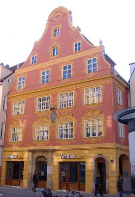 Am Stein 5, ehemaliger Buchverlag und Buchhandlung, sog. Jesuitenbibliothek, dreigeschossiger Putzbau mit barockem Schweifgiebel und filigranem Stuckdekor sowie zweiflügeliger, reich geschnitzter barocker Haustür, auf mittelalterlichen Bestand zurückgehend un
