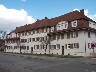 Nürnberger Straße 27-31, 35-39, Eichendorffstraße 2-4, teile der Wohnkolonie II der ehemaligen Baugenossenschaft der Militärarbeiter Ingolstadts, Kleinwohnungen als Blockrandbebauung zu einer spitzwinkligen Baugruppe mit Eckausbildung zusammengeschlossen, bzw. als dreiteilige Häuserzeile von der Straß