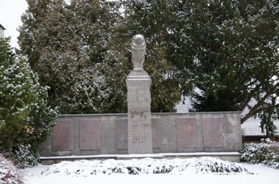 Kriegerdenkmal, denkmal für die im Ersten Weltkrieg gefallenen Gemeindemitglieder in Form eines von einem Löwen bekrönten Pfeilers, um 1925, nach dem Zweiten Weltkrieg ergänzt