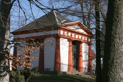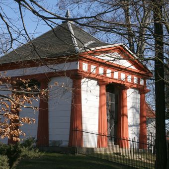 Mausoleum in Neschwitz, Einzeldenkmale der Sachgesamtheit Neuer Friedhof Neschwitz (siehe Sachgesamtheitsliste - Obj. 09304034, gleiche Anschrift); Mausoleum quadratischer Bau mit Pyramidendach, Putznutung, dorische, sich stark verjüngende Halbsäulen, über dem Eingang Tr