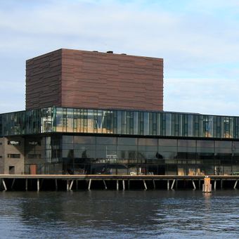 Le Théâtre Royal Danois se dresse sur le port de Copenhague avec une façade en briques brun foncé et un étage supérieur vitré.