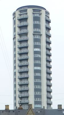 Le bâtiment est accessible par plusieurs entrées au niveau de la rue qui mènent à différentes sections résidentielles. La disposition permet de circuler facilement autour de la structure et d'observer l'architecture sous différents angles dans la zone environnante.