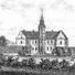 Le manoir Renaissance à trois ailes présente des murs en briques rouges sur des fondations en granit, avec des toits pentus en ardoise et une tour carrée.