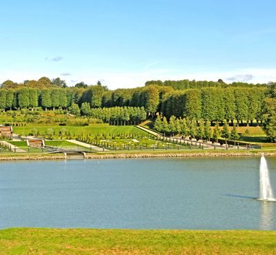 Les visiteurs peuvent explorer le jardin baroque formel et le parc paysager naturel, qui comprend des chemins de promenade autour du lac du château.