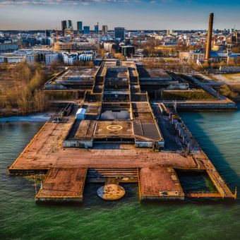 Le bâtiment rectangulaire en béton s'étend le long du front de mer avec de grands escaliers menant à plusieurs niveaux et plateformes d'observation sur la mer Baltique.