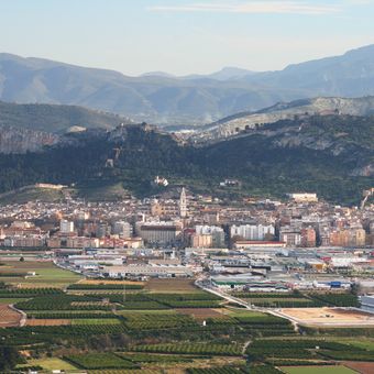 La municipalité de Xàtiva s'élève sur une colline avec un château au sommet, entourée d'orangeraies et de végétation méditerranéenne à 115 mètres d'altitude.