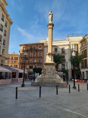 La Plaza de las Flores est une place piétonne centrale à Murcia avec plusieurs bars, restaurants et terrasses extérieures disposés autour d'une fontaine en bronze appelée La Niña de las Flores. La place relie les espaces adjacents et offre un accès direct au Marché Verónicas.