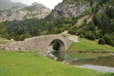 Le pont de Bujaruelo traverse une vasque de rivière avec des arches en pierre, reliant les deux côtés de la vallée escarpée des Pyrénées.