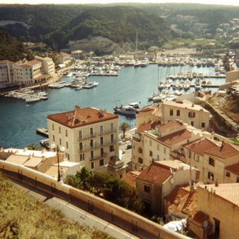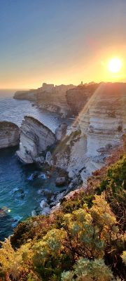 La ville fortifiée de Bonifacio s'étend sur une péninsule calcaire étroite s'élevant à 70 mètres au-dessus de la mer Méditerranée.