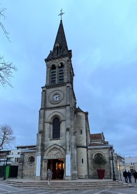 L'église présente une flèche élancée, une façade en pierre et des éléments architecturaux caractéristiques des édifices religieux du XIXe siècle.