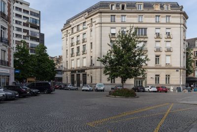 La Place Honoré Commeurec forme un triangle entre la rue de Nemours et la rue Jules Simon, bordée au sud par le bâtiment des Halles Centrales.