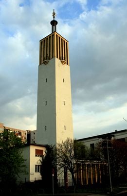 Le temple présente une haute tour, un portique à colonnes surmonté d'une croix et des fenêtres rondes dans un style architectural Art Déco.
