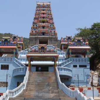 Le temple se dresse au sommet d'une colline de granit de 180 mètres, avec un sanctuaire principal dédié au Seigneur Murugan et des sculptures en granit noir.