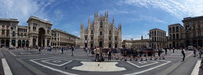 La Piazza del Duomo est une place à Milan qui forme le cœur historique de la ville et borde la Galleria Vittorio Emanuele II. Le vaste espace relie plusieurs rues et s'ouvre sur la façade de la cathédrale, entourée de bâtiments à arcades et de palais du XIXe siècle.