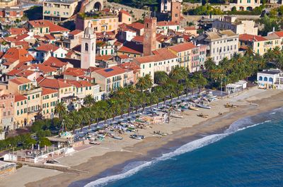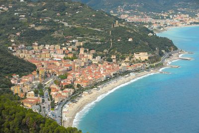 Noli est une commune côtière sur la Méditerranée en Ligurie, protégée par des murs de pierre médiévaux encadrant la vieille ville. Le centre contient des rues étroites menant au bord de l'eau, avec des structures historiques et des tours le long du littoral.