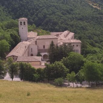Le Monastère de Fonte Avellana se dresse à 700 mètres d'altitude sur le Mont Catria, avec une cathédrale en forme de croix latine à nef unique.