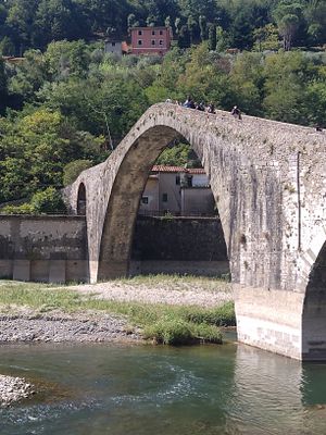 Le pont de la Madeleine traverse le fleuve Serchio sur 95 mètres avec un arc principal de 37,8 mètres de portée.
