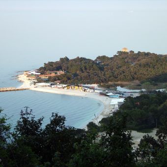 Portonovo est un village côtier le long d'une plage de graviers et de roches dans le parc national de Conero, avec une végétation méditerranéenne et des falaises de calcaire blanc au pied du Monte Conero. La baie abrite plusieurs installations de plage, des hébergements et des restaurants de fruits de mer, reliés par des sentiers de randonnée qui longent le rivage.