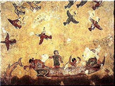 La chambre funéraire souterraine présente des fresques détaillées montrant des bateaux de pêche, des chasseurs avec leurs chiens et des activités maritimes.