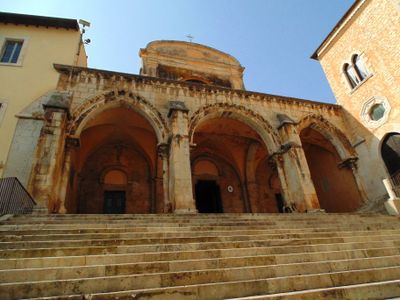 La Concattedrale di Santa Maria Annunziata présente un portique à trois arches avec des colonnes corinthiennes et des sculptures médiévales d'animaux sur ses piliers.