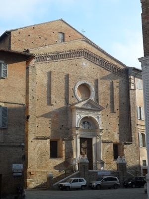 San Domenico est une eglise aux elements gothiques situee face au Palais Ducal sur la Piazza Danti. La facade affiche un portail renaissance remarquable en pierre de travertin avec des colonnes cannelees et des chapiteaux corinthiens, tandis que l'interieur a ete largement transforme au XVIIIe siecle.
