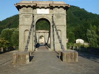 Ponte delle Catene est un pont suspendu sur la rivière Lima à Fornoli présentant deux arcs en pierre de style néoclassique avec des chaînes de fer soutenant un pont de bois. La structure s'étend sur environ 50 mètres au-dessus de l'eau.