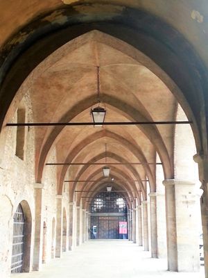 La Cittadella viscontea est une forteresse avec quatre ailes entourant une cour centrale, dominee par deux tours massives. La section nord dispose d'une galerie d'arcades, et l'ensemble du complexe est protege par des murs defensifs epais.