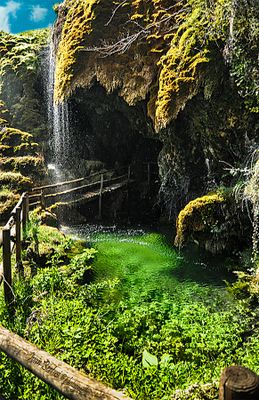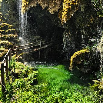 Les grottes et sources s'étendent sur 4.7 hectares, présentant des formations calcaires, des falaises stalactitiques et un réseau de cours d'eau souterrains.