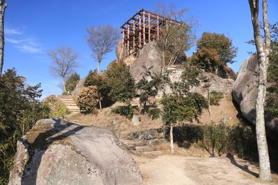 Le château surplombe la rivière Kiso depuis le mont Takamori à 432 mètres d'altitude, intégrant des formations rocheuses naturelles dans ses murs.