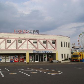 La station routière Ai-land Yubetsu longe la Route Nationale 238 à Hokkaido, avec un restaurant surplombant le lac Saroma et un parc d'attractions.