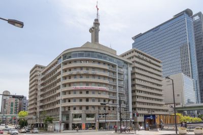 Le Bâtiment Asahi Shimbun se dresse dans le paysage urbain d'Osaka, abritant des bureaux éditoriaux, des installations de production et des espaces de réunion.