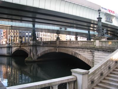 Nihonbashi est un passage en pierre avec deux arches de granit qui enjambe la rivière Nihonbashi et porte des lampadaires ornés en bronze à ses quatre coins. Sur la chaussée, une circulation dense s'écoule aujourd'hui, tandis qu'en dessous l'eau coule à travers un canal étroit dans la ville.