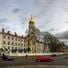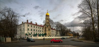 La Maison de Prière Grebenstchikov présente des éléments architecturaux byzantins avec une fine tour surmontée d'un dôme doré au 73 rue Krasta.