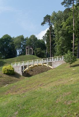 Temple Hill à Alūksne est un monument en granit qui s'élève à 35 mètres de haut sur une péninsule du lac Alūksne, offrant des vues sur l'eau et les paysages environnants. La structure repose sur une élévation naturelle à côté du onzième plus grand lac de Lettonie.